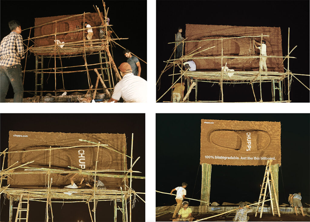The innovative outdoor campaign — created to promote Chupps’ eco-conscious flip-flops — was designed and produced entirely from biodegradable materials, including natural fibers, plant-based inks, and compostable adhesive. Once its lifecycle ends, the billboard can decompose completely, leaving behind zero waste and no environmental footprint.