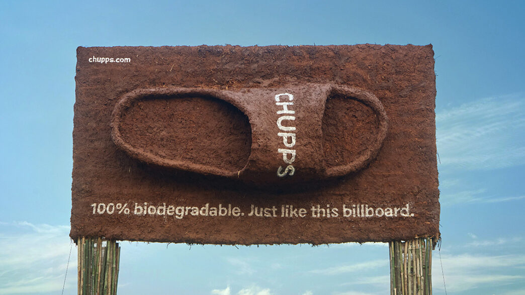 The innovative outdoor campaign — created to promote Chupps’ eco-conscious flip-flops — was designed and produced entirely from biodegradable materials, including natural fibers, plant-based inks, and compostable adhesive. Once its lifecycle ends, the billboard can decompose completely, leaving behind zero waste and no environmental footprint.
