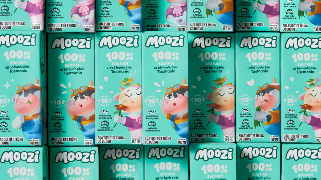 At the heart of Moozi’s design philosophy is a deliberate balance between parental reassurance and childlike delight. Vietnamese parents today are more discerning about quality, origin, and nutrition, especially when choosing products for their children. Moozi answers this with 100% imported fresh milk from grass-fed Tasmanian farms, conveying purity through restrained, origin-led packaging that feels authentic and trustworthy.