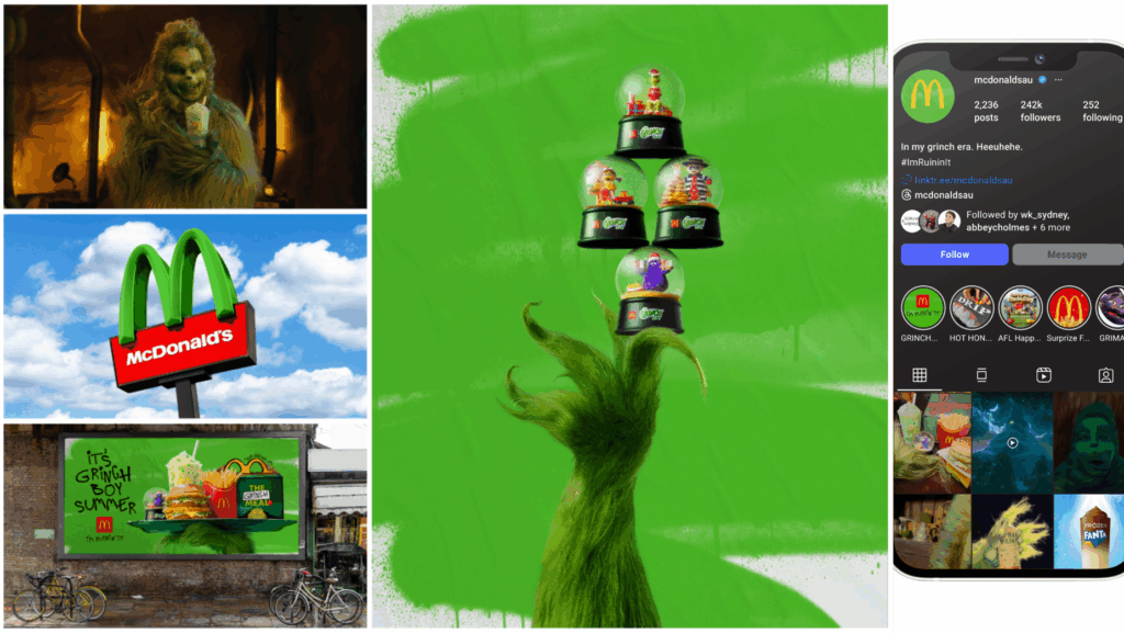 His antics spill across OOH and social media, with iconic green visuals and cheeky slogans like “It’s Grinch Boy Summer” and “Unhappy Holidays!” On Instagram, the Grinch takes over McDonald’s Australia’s page, grumbling about the sunny Christmas with lines such as, “its supposed to snow at Christmas, y dis place so stupid?”